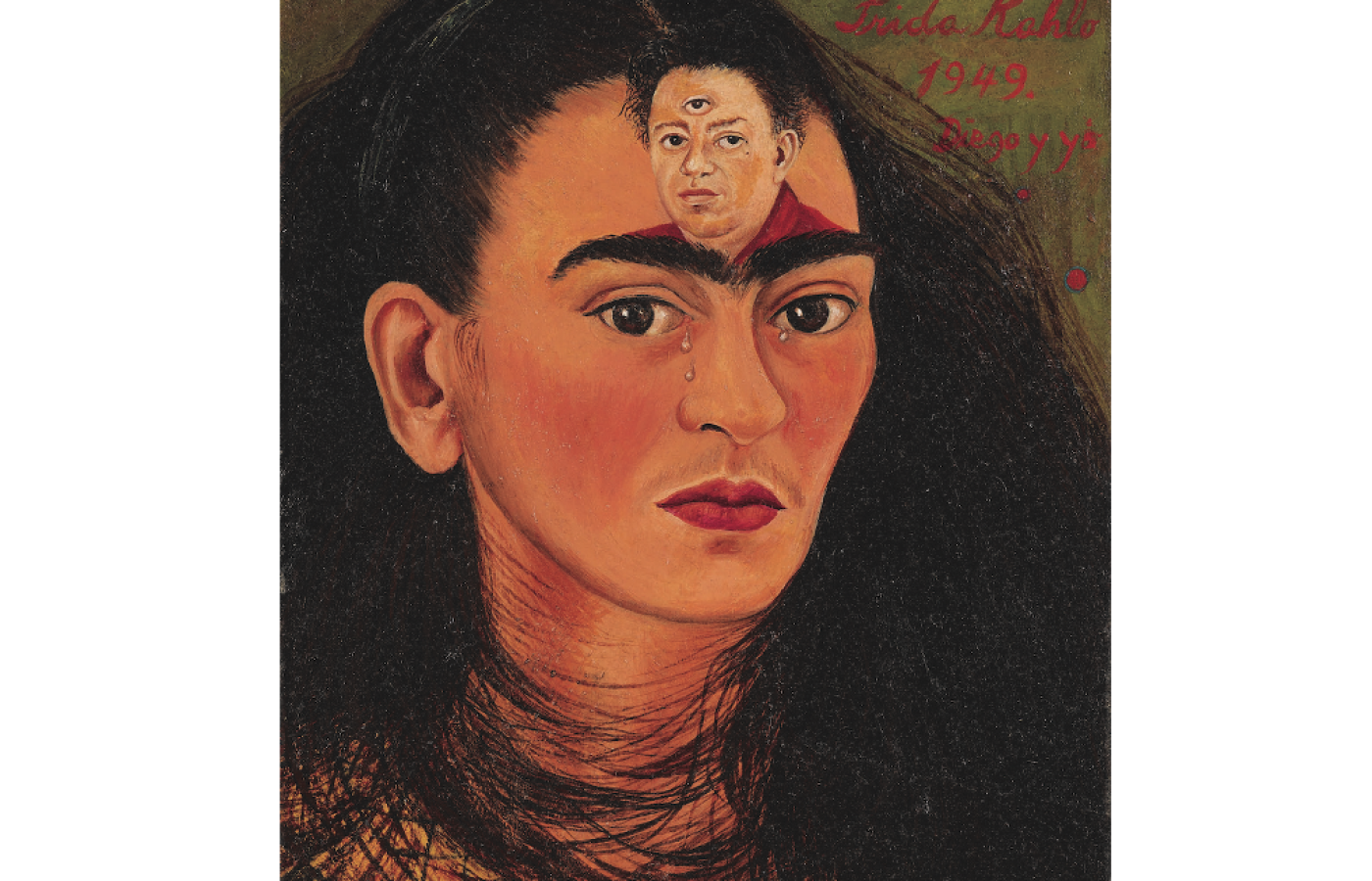 The painting depicts the artist gazing tearfully at the viewer; superimposed on her forehead is an image of her husband, the Mexican painter DIEGO RIVERA, who has a third eye. It comes to market after being held privately for 30 years. The descendant of a New York collector is selling it.